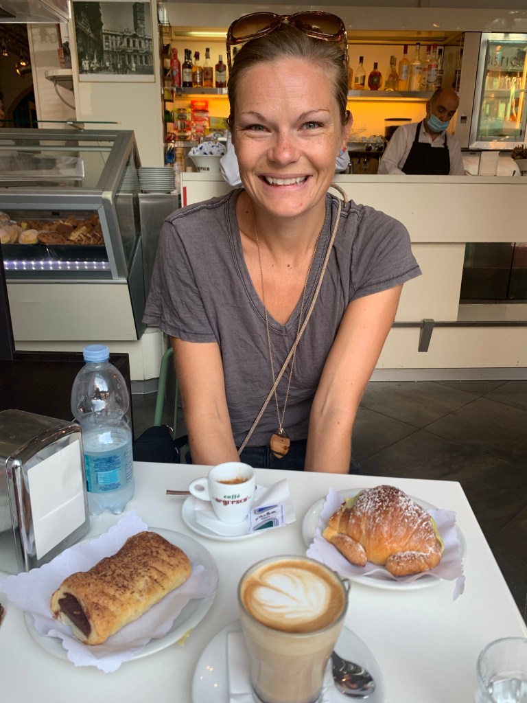 About 730am we went down to the café to get the breakfast part of our B&B. The waiter told us we could have whatever we wanted. Pastry? Coffee? Sandwich? Anything. He let us get an espresso, a cappuccino, a prosciutto sandwich, and two pastries. I considered asking if I could also get a fruit tart but I didn’t want to find out at what point he would make us pay extra and I didn’t want to give him fuel for gossip about fat Americans later. I got one chocolate pastry and one pistachio and they were amazing.