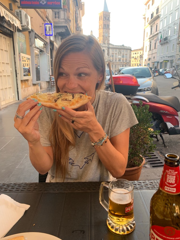 We then chilled ourselves under the AC until evening. Finally hungry again we ventured back to the main street to a pizzeria we had seen earlier. We got a mushroom pizza and two Peroni beers for pretty cheap. We then walked back toward our hotel and got gelato from the cafe under our hotel. I got tiramisu flavor and was not disappointed. We admired the outside of the Santa Maria Maggiore Basilica as the sun set at nearly 9pm.