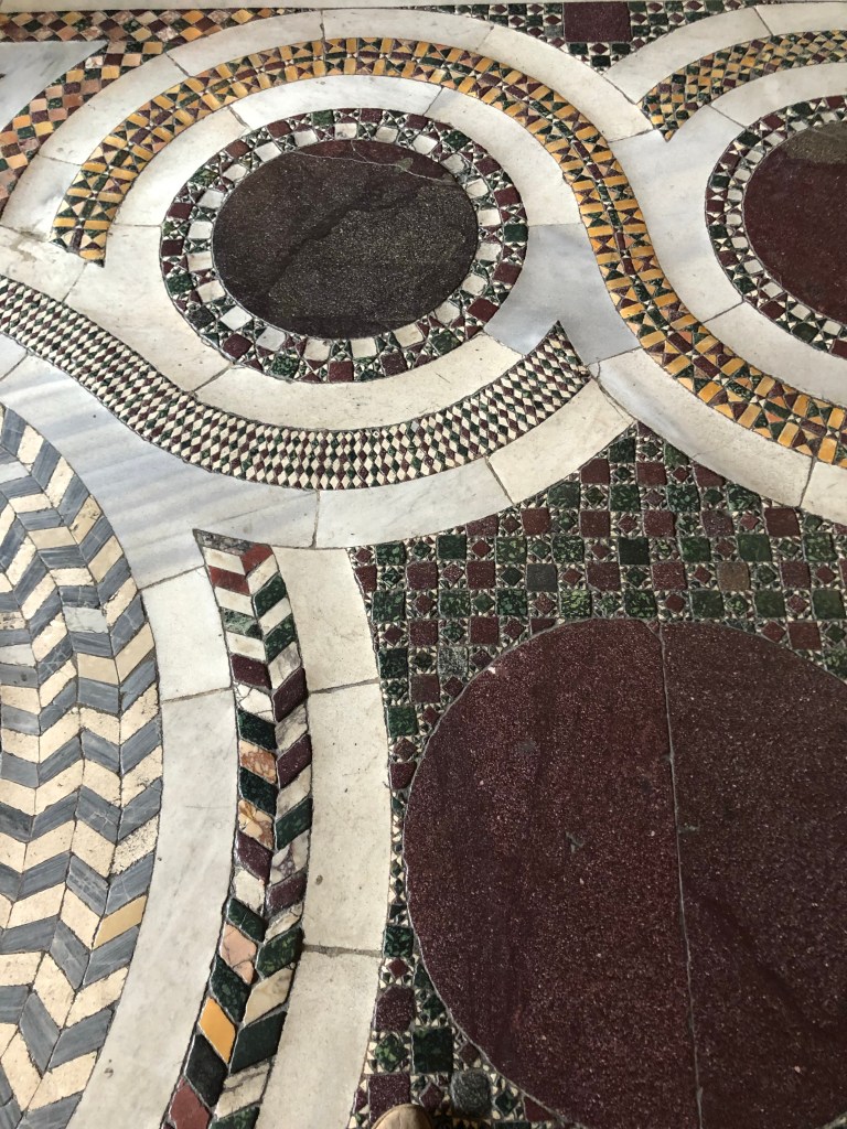 The ceiling was covered in gilded gold squares and everywhere you looked was different colored marble or stone. The floor was a giant mosaic and each wall was covered in different colors, broken up by carved reliefs or beautiful paintings. We sat and admired all the stone and handiwork and imagined what the other historical sites, like the Colosseum, would have looked like fully decorated like this before they were repurposed for Christian churches.
