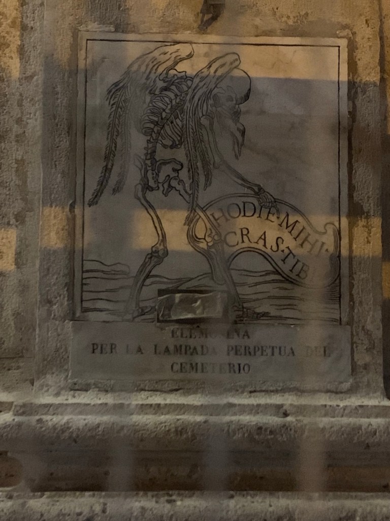 Sadly, the thing we had wanted to see most was a church full of bone sculptures that is under renovation (and apparently has been for a while). Still, we could look at the outside and the cool carved poster that says “today I die, tomorrow, you” and has a slot under it for donations. The church was used by a group of monks who took on the task of collecting the city’s dead during the plague years. With so many body parts and the river overflowing all the time (so burying was tricky) they repurposed bones to make chandeliers, crosses, and other churchy objects.