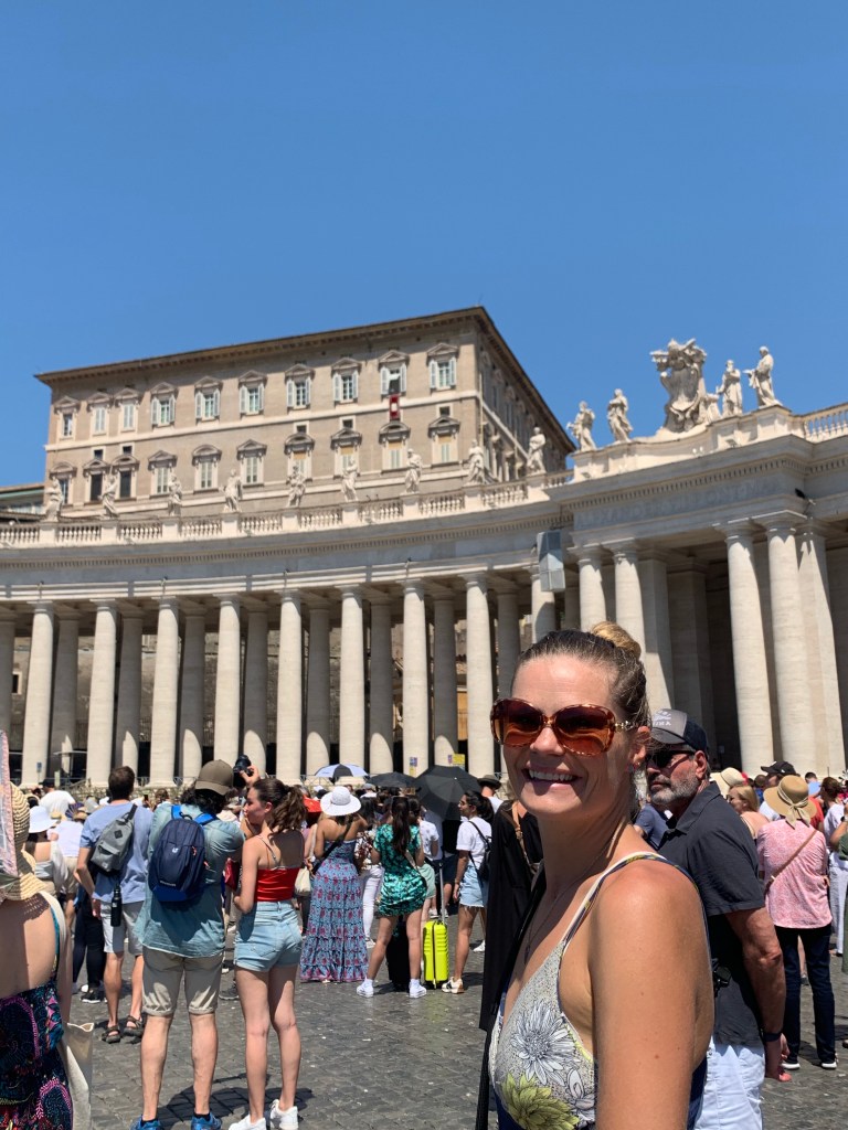We stood, sweating, in the direct sun, waiting for the Pope to come out from his teeny tiny window. What little shade there was underneath the colonnade was packed shoulder to shoulder with people, and we wouldn’t have been able to see his window from there anyway.