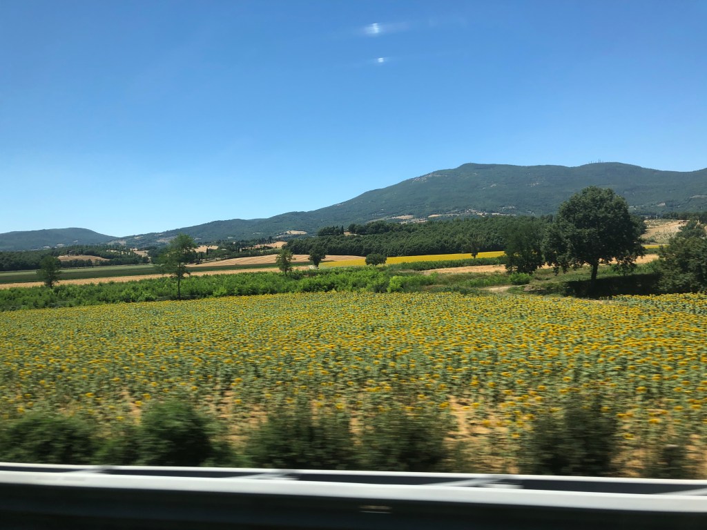 So we got a sandwich and hung out in the air conditioning. The bus came right on time. The bus ride to Rome was smooth and went by quick. One man stunk so bad of stale cigarettes I thought I might be sick and another man was sniffing snot back into his head so loudly and aggressively that I thought he was going to be sick. Luckily we were driving through beautiful Tuscany and I noticed many of the fields were completely full of giant sunflowers.