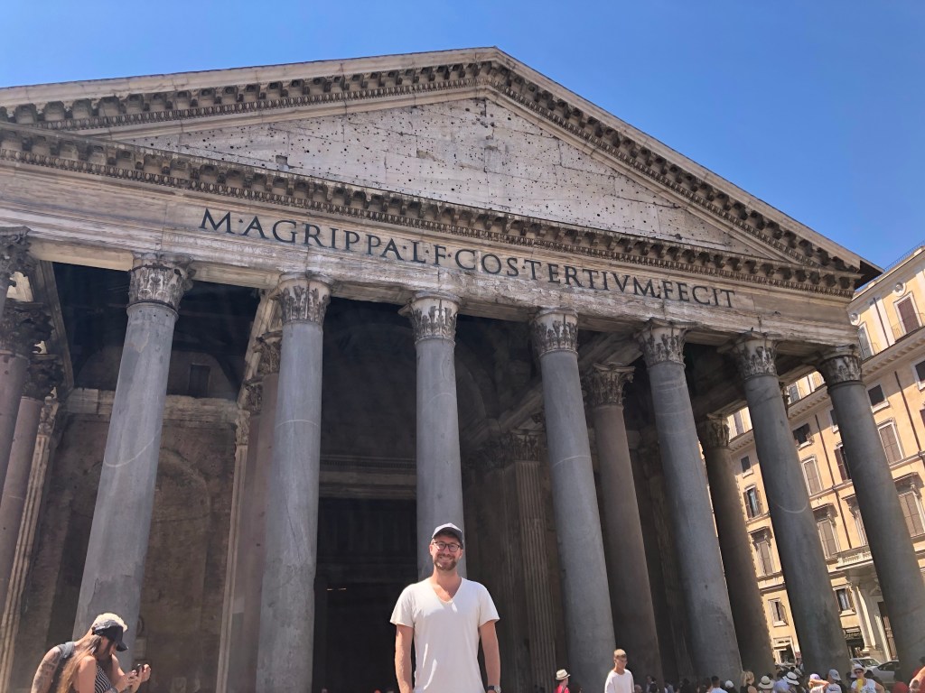 When we arrived to the Pantheon I didn’t recognize it because the outside was so drab. Back in its day, it would’ve been covered in bronze and marble. But, these materials have all been pilfered for other buildings such as the bronze altar in the Vatican.