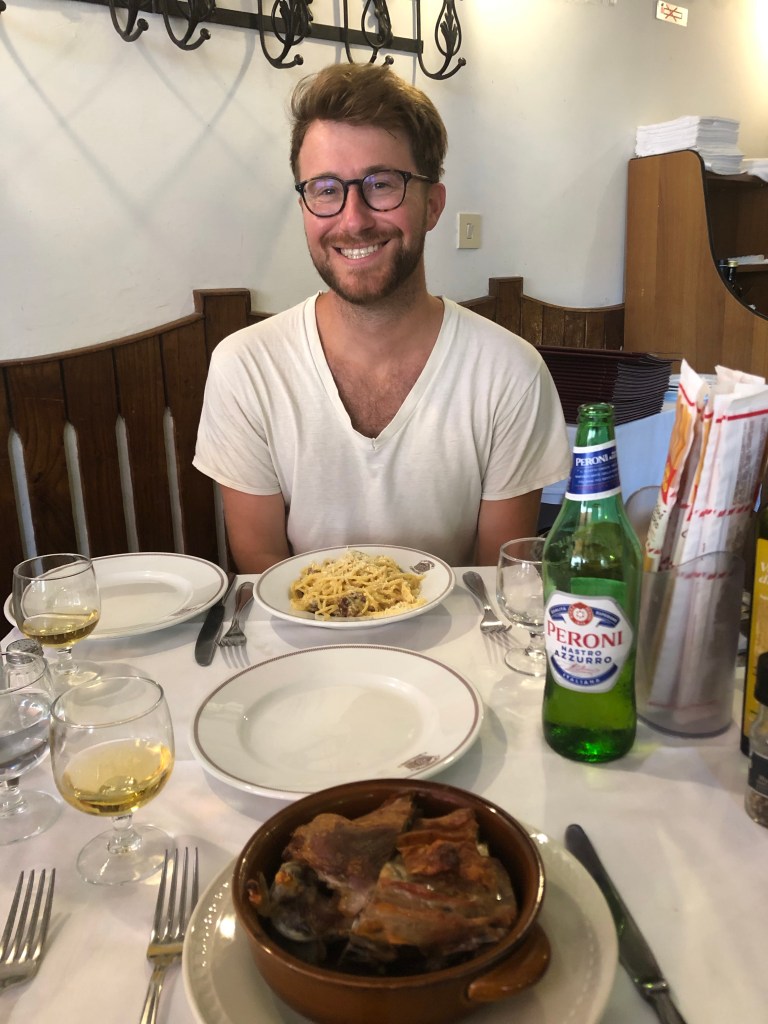 We got Jewish-style fried artichoke and fried, anchovie filled zucchini flower, which was weird but good. We split spaghetti carbonara which was very eggy and cheesy, and roast lamb. The lamb was a big ol’ hunk of meat but it was flavorful and good.