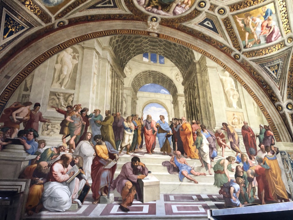 Also the Raphael rooms which are four rooms painted by Raphael in early 1500s and intended for apartment rooms for Pope Julius II. The frescoes take up all of the visual space of the walls and ceiling. The most famous and interesting fresco was The School of Athens which depicts famous people like Aristotle, Plato, Euclid, and Ptolemy just hanging out and chatting to each other.