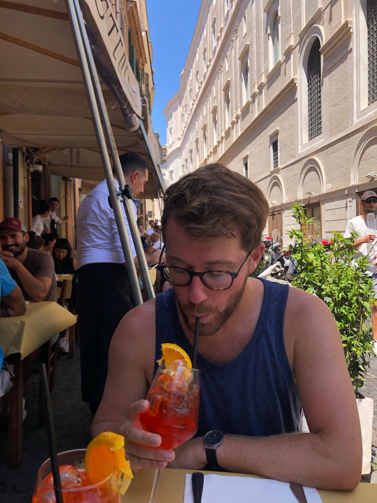 Afterward we walked back toward our Airbnb and went to a restaurant we had spotted before, just on the edge of Campi de Fiori. We got one of the last tables and sat down before realizing we had no idea how expensive the place was. We ordered Aperol Spritzes and two pastas to share. We got gnocchi with tomato sauce and mozzarella and a thick, spaghetti-like noodle with greens and bits of fried pork cheek that was probably the best dish we’ve had in Italy.