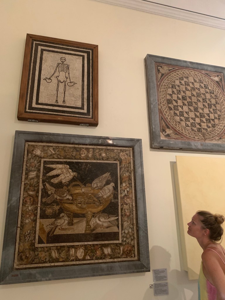 The museum was essentially a repository of everything that had been unearthed from Pompeii, Herculaneum (another Vesuvius victim), and other archeological sites in the area. We were most impressed with the mosaics pulled from Pompeii as many of them were as good as paintings, or better, and from 1st century CE.