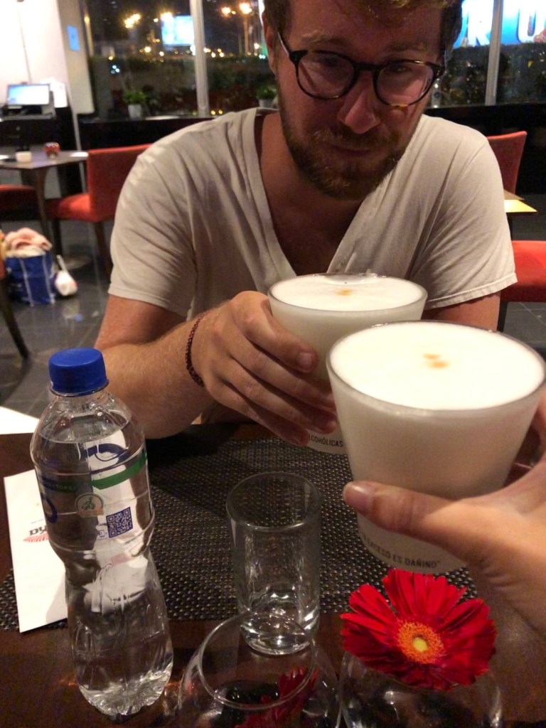 We pushed through all the yelling taxi men to literally walk across the street from the airport to the Wyndham, checked in, and were able to get pizza and pisco sours for a late dinner. The pisco sours were surprisingly tasty for an airport hotel and surprisingly STRONG. I said “I must feel it more because of the elevation” and Carl replied “We aren’t even at elevation- we’re still in Lima at sea level!”